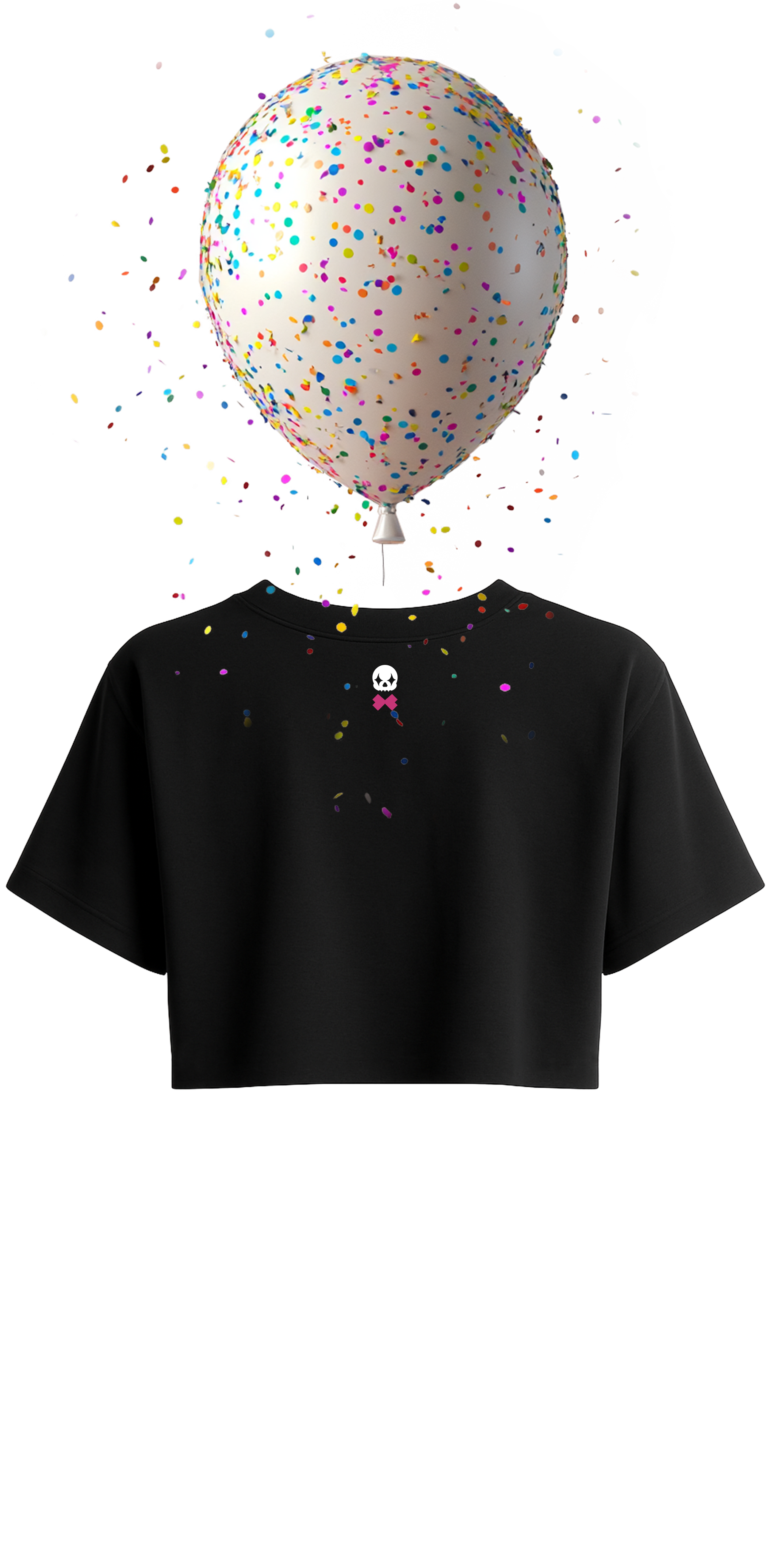 A sweet silhouette with a slasher twist — this crop top is for the dangerously unforgettable. Featuring a doll in a Jason mask and a bow, this piece laughs in the face of emotional healing and ghosts every therapist’s advice.