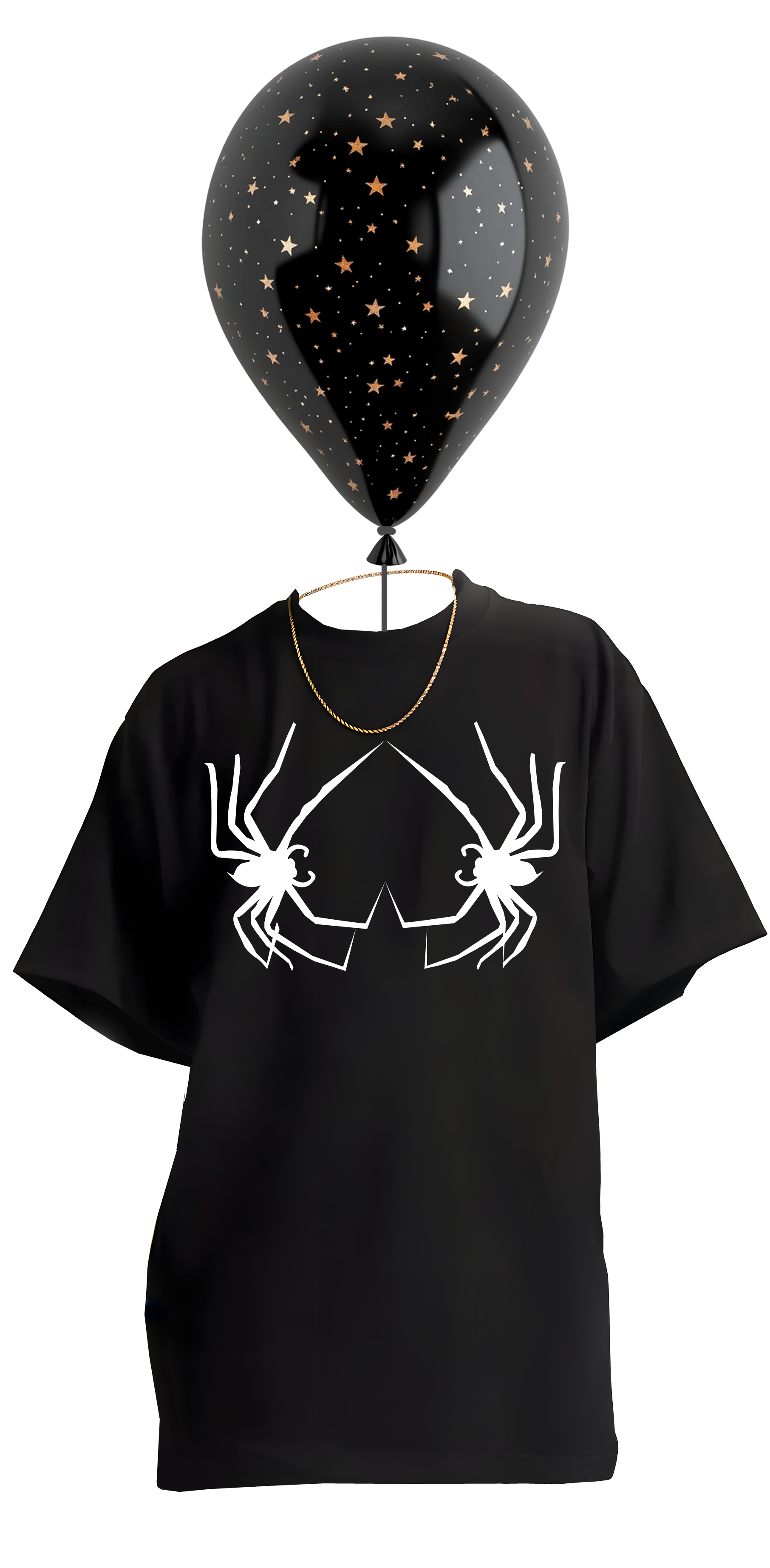 Bold front print: mirrored spiders forming a sharp-edged heart