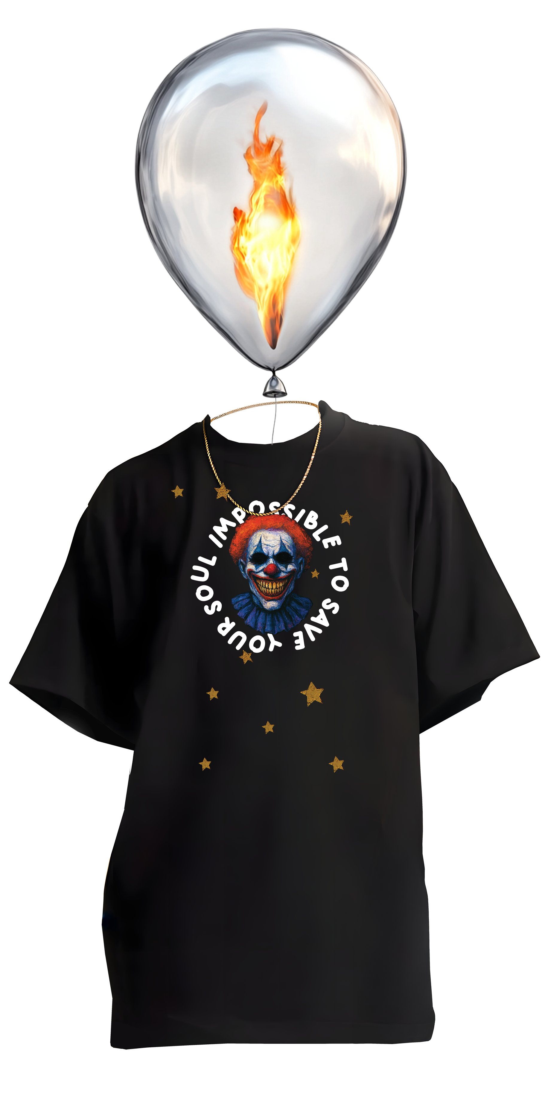 You were warned, but you showed up anyway — to the party, to the séance, to life. This tee isn’t just a statement, it’s your spiritual eviction notice. Pair a sinister grin with golden stars and a balloon from hell. It’s campy. It’s cursed. It’s canon.