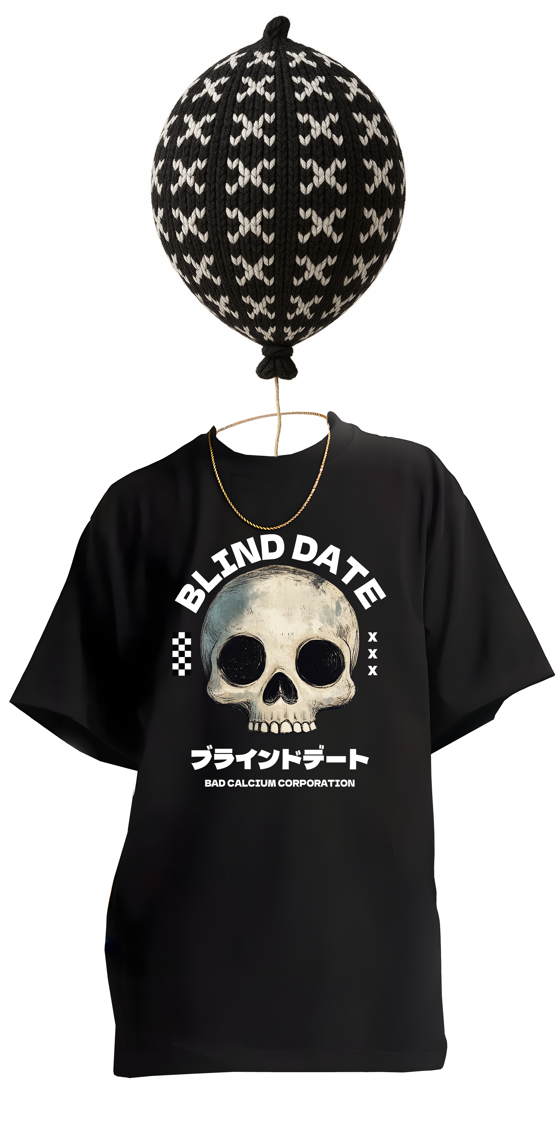 The Blind Date tee is for those who flirt with death, trust no one, and somehow still say “lol” after sending a risky text. Featuring a clean graphic skull, bold typography, and cult-corporate branding in Japanese — this shirt is pure sarcastic doomcore.