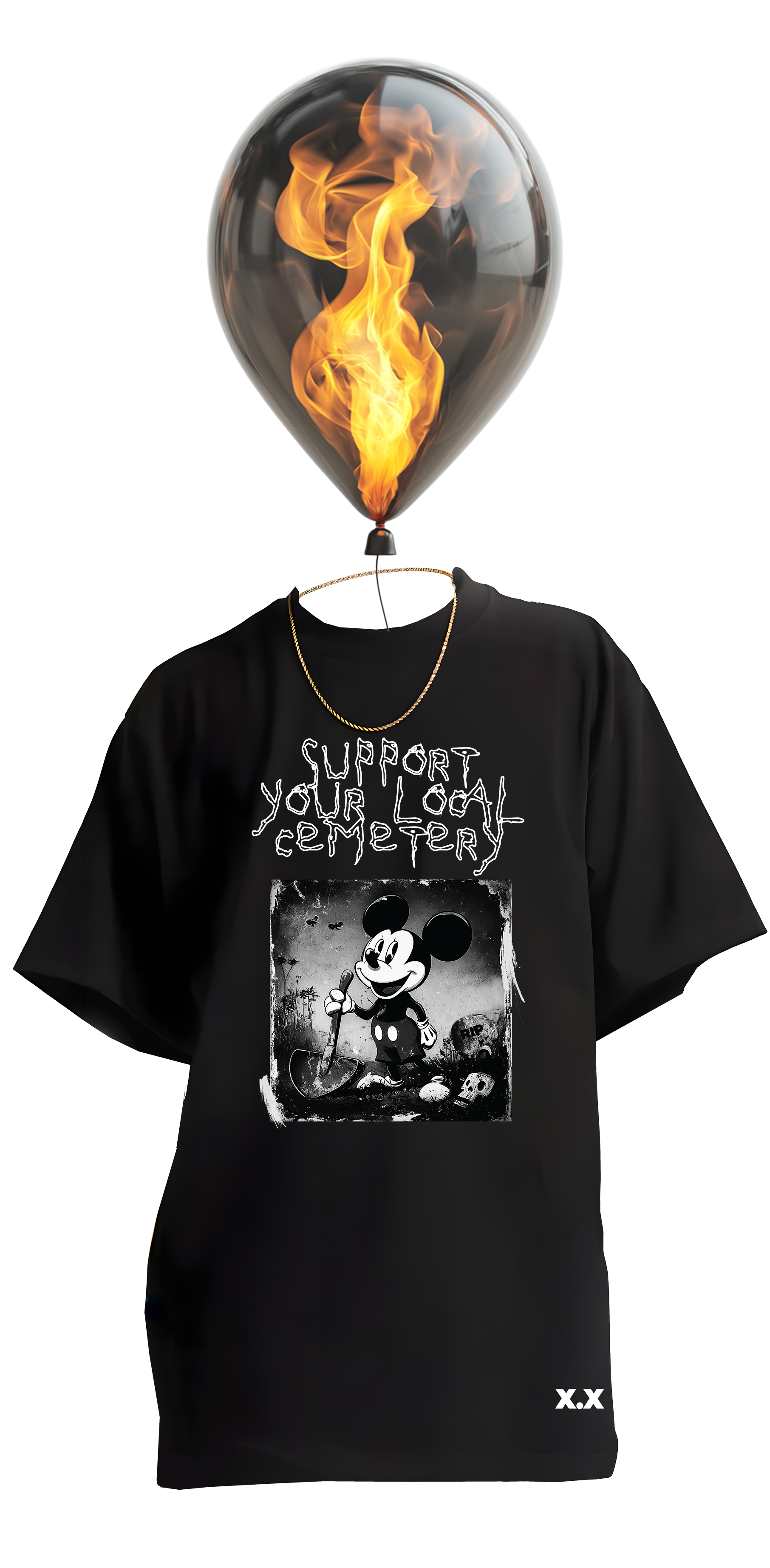This bold oversized shirt features a disturbingly cheerful grave-digger mouse reminding you to keep it local — and maybe a little deranged. Perfect for the goth who's nostalgic and nihilistic.